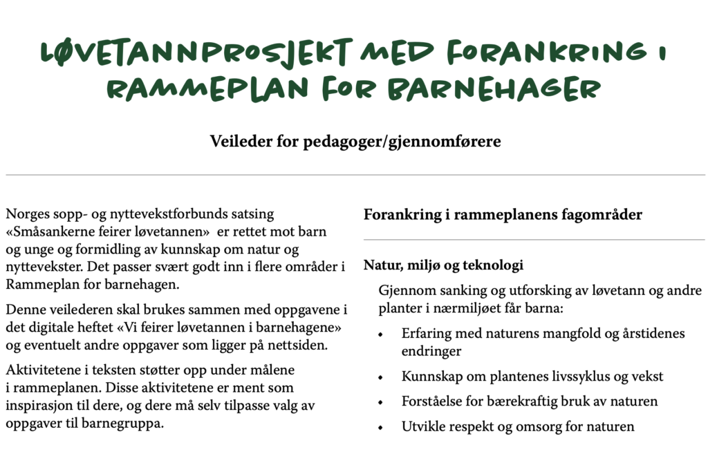 Veiledning i løvetannopplegg for pedagoger og andre ansatte i barnehager.